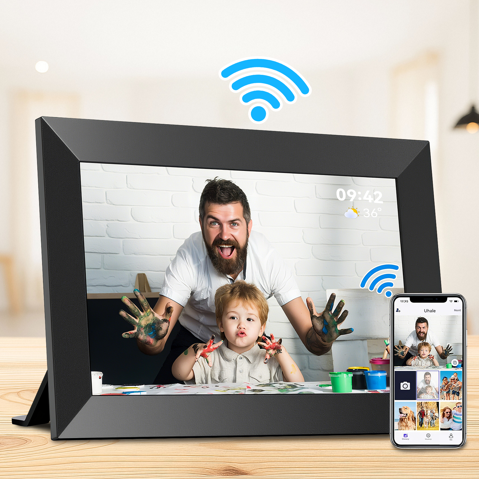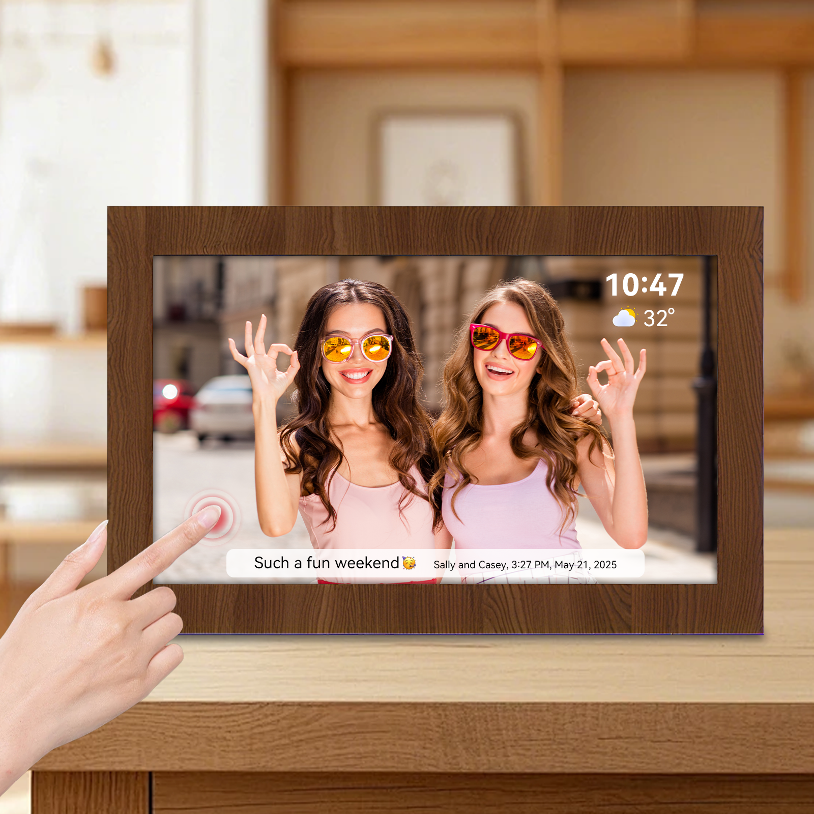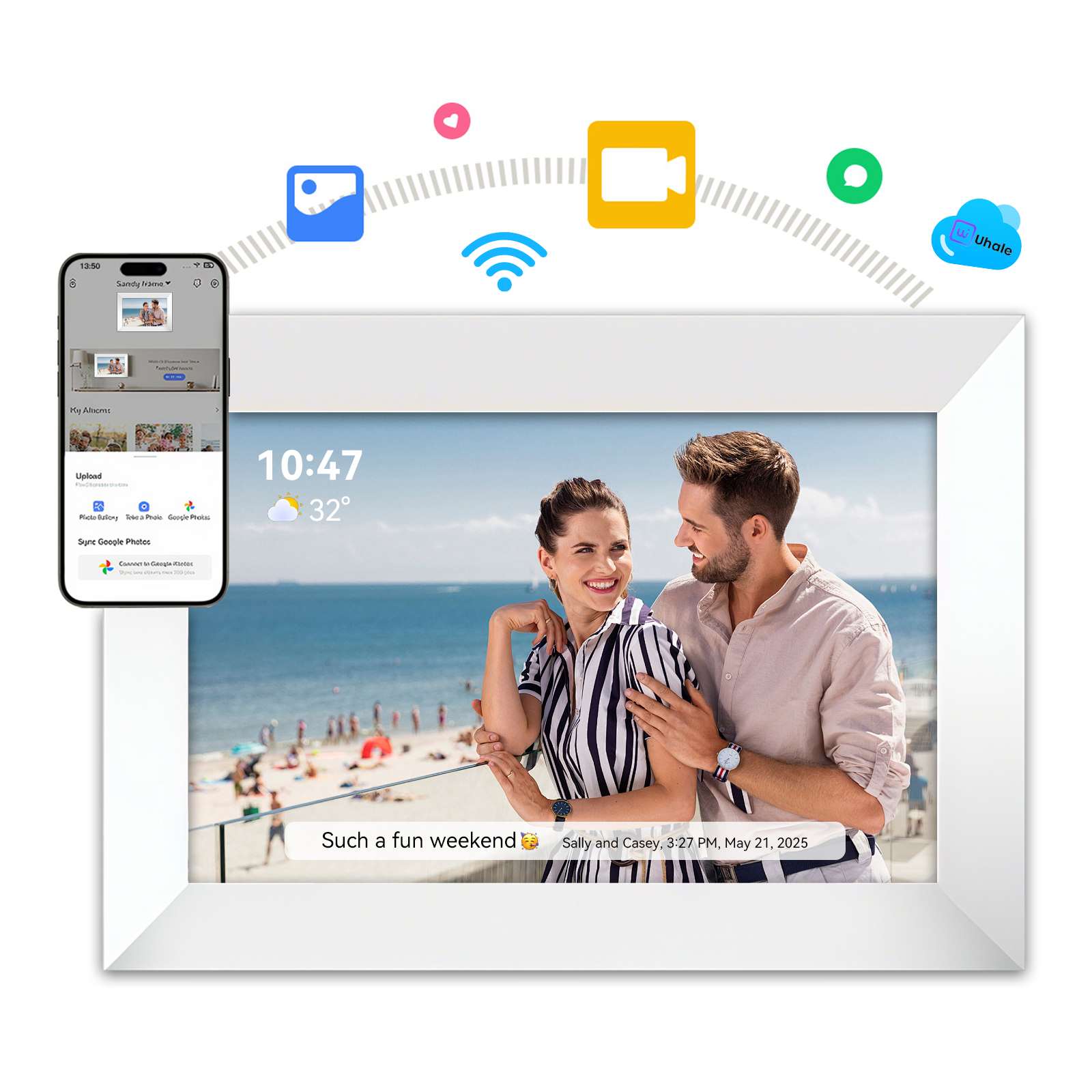 Vassco Smart Digital Photo Frame er et smart knutepunkt for hjemmet ditt. Den blander en klokke, kalender og sanntids værvisning med en levende lysbildefremvisning. Med et enkelt trykk kan du "like" bilder for å dele din kjærlighet, og forvandle hvert minne til et interaktivt, hjertevarmt øyeblikk.