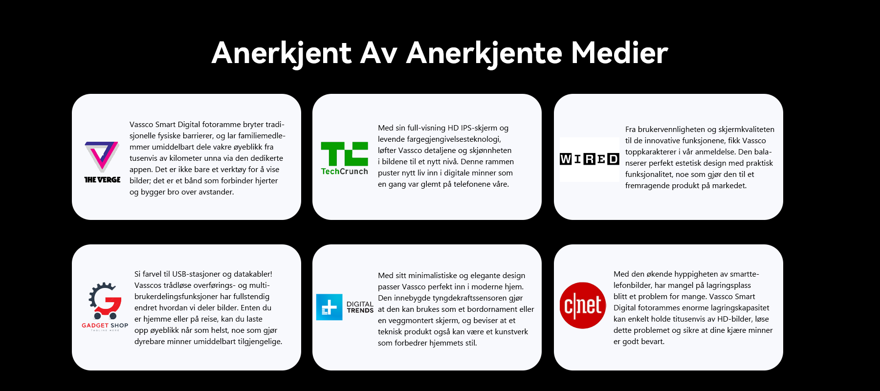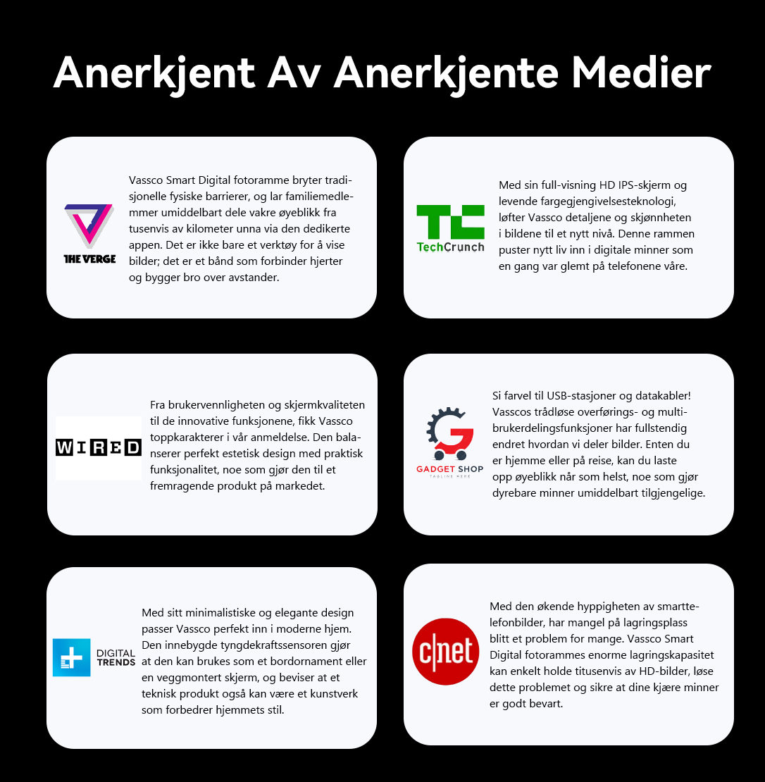 Resultatet ble Vassco Smart Photo Frame – med kraftig Wi-Fi og et enkelt, brukervennlig design, gjør det deling enkelt samtidig som det viser hvert øyeblikk i levende HD. Vasscos misjon er klar: å forvandle digitalt rot til gleden av å dele, slik at du kan fokusere på minnene, ikke teknologien.