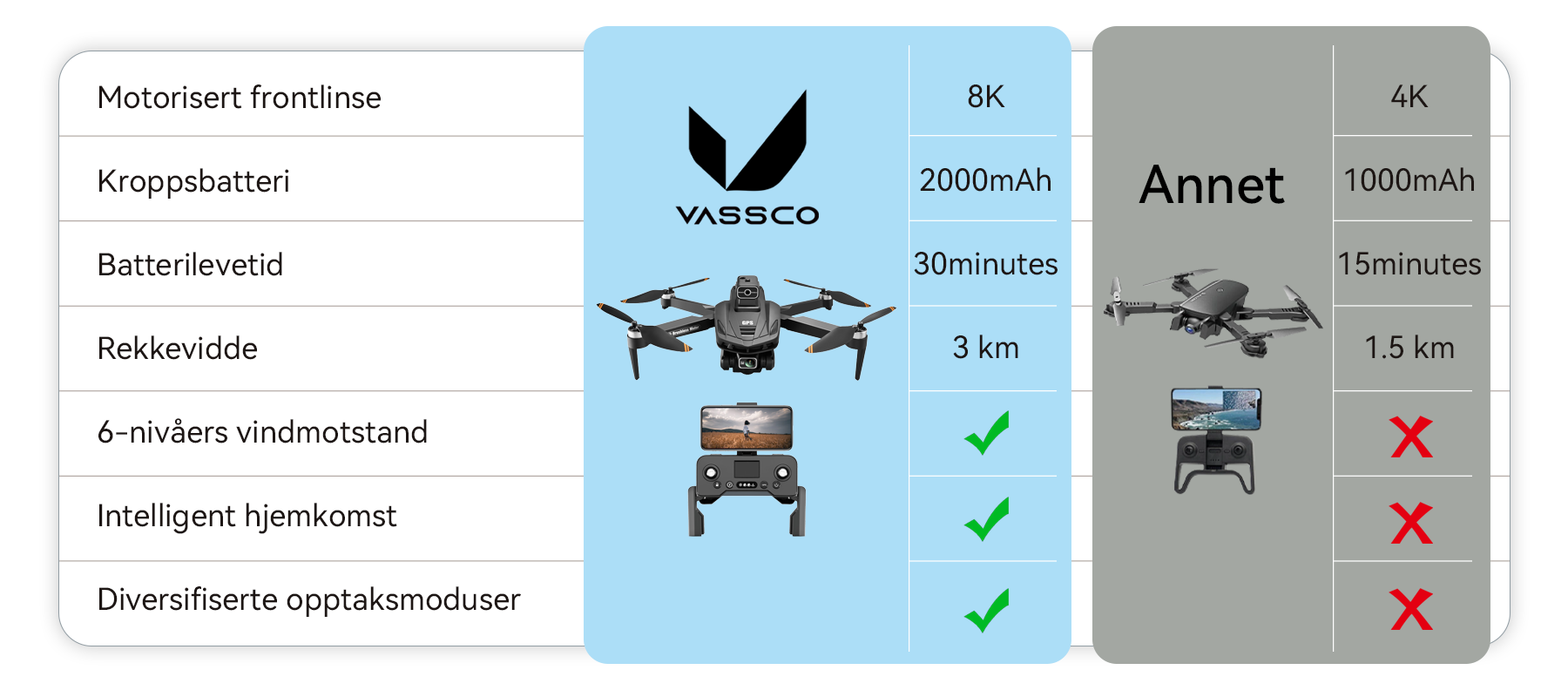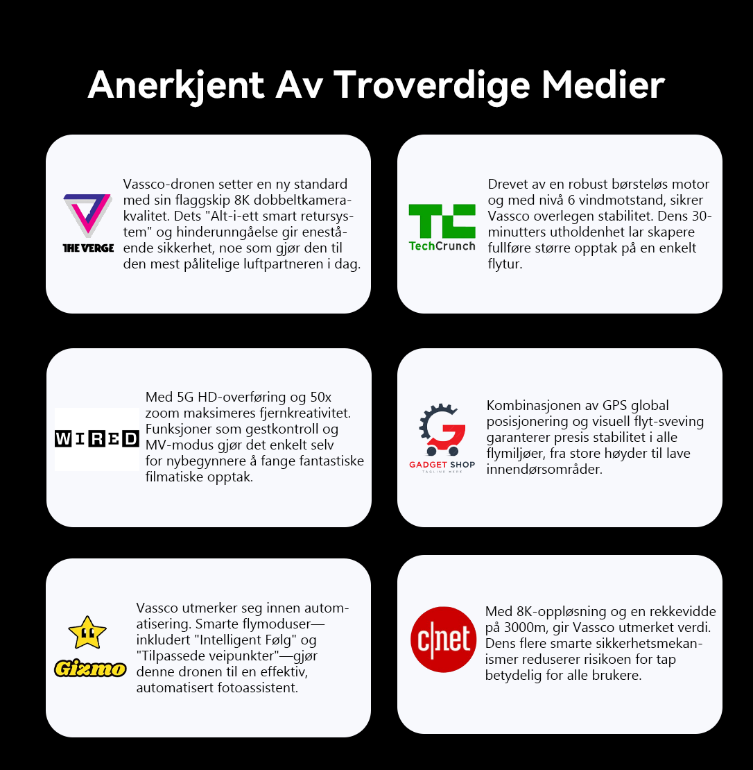 Vassco GPS-dronen ble født. Vassco GPS-dronen leverer stabilitet og presisjon som aldri før. Det intelligente flysystemet, GPS-navigasjonen og avansert unngåelse av hindringer holder den stødig i alle miljøer, mens 8K dobbeltkameraoppsettet med AI-forbedring sikrer at hvert bilde er skarpt, levende og filmatisk.