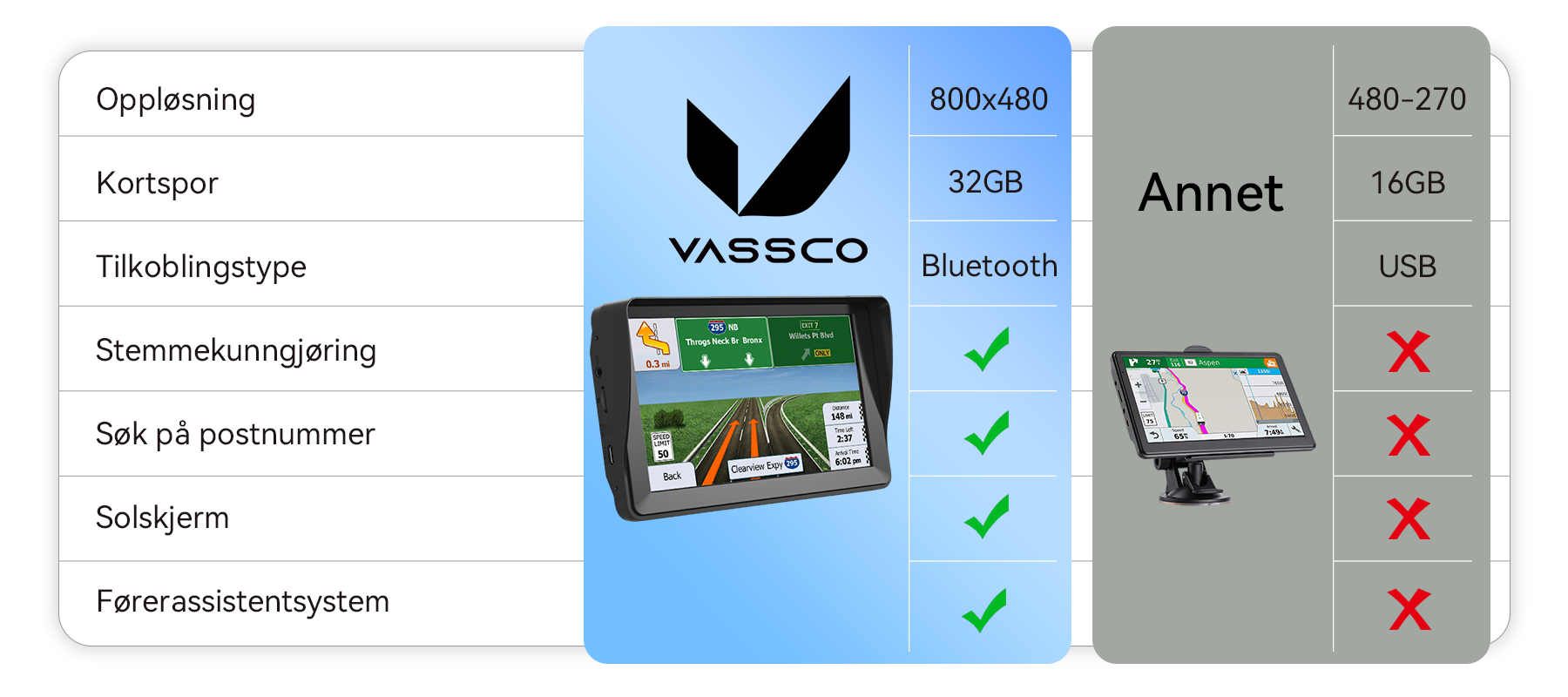 Vassco Sat Nav – Din alt-i-ett GPS-enhet, som sikrer deg en trygg, pålitelig og bekymringsfri kjøretur med sømløs tilkobling, nøyaktig GPS og gratis kartoppdateringer på livstid.